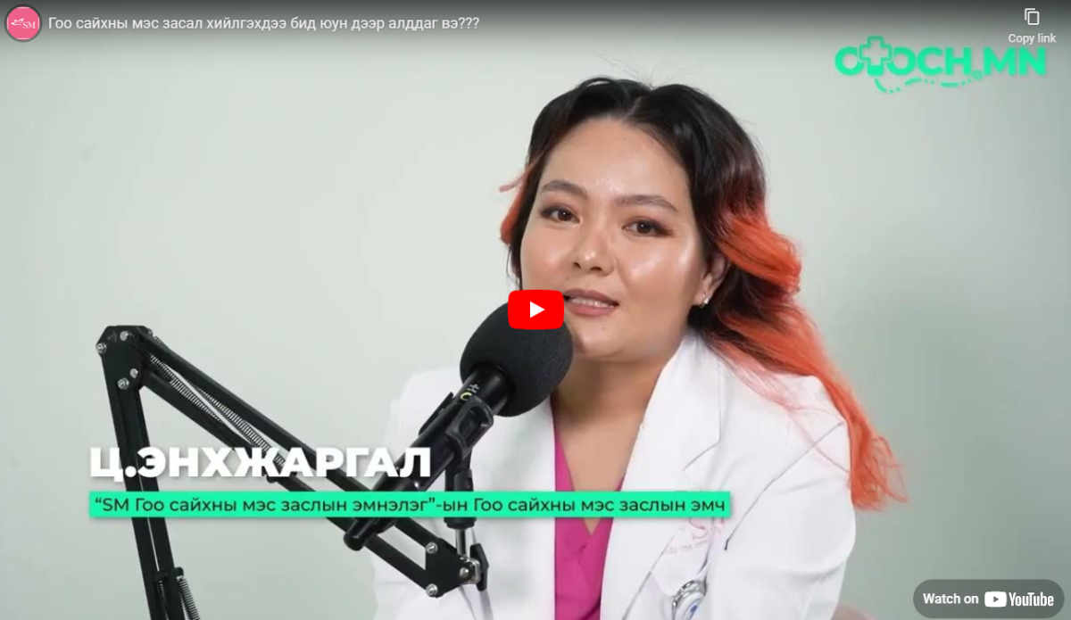 Манай "SM" Мэс заслын төрөлжсөн мэргэшлийн эмнэлгийн "Anti-aging" буюу залуужуулах эмчилгээний төвийн ҮЗЭСГЭЛЭНТ эмч" Ц.Энхжаргал эмчийн маань арьсны талаарх зөвөлгөөг хүргэж байна.