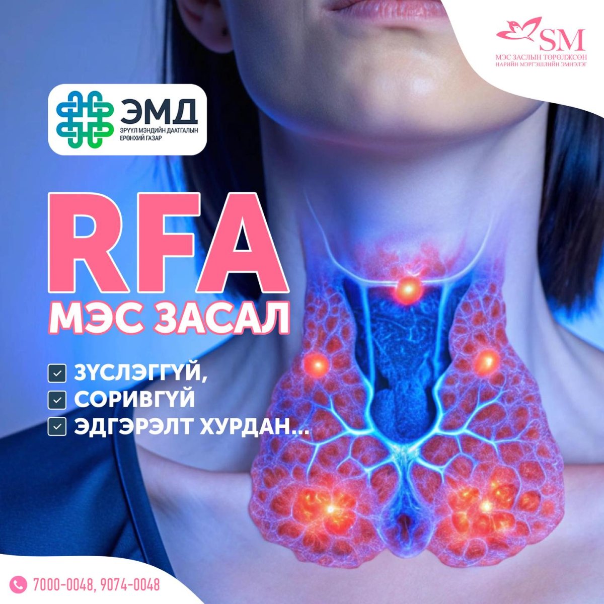 Манай эмнэлэг нь бамбай булчирхайн хоргүй хавдрын хамгийн сүүлийн үеийн дэвшилтэт, хөнөөл багатай мэс заслын арга болох "RFA" мэс заслыг ЭМД-р хийж үйлчилж байна.